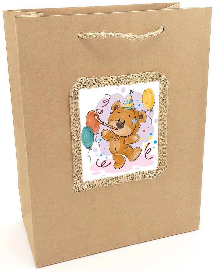 Torebka na prezent dla dziecka z motywem pluszowego misiaWyjątkowa torebka na prezent dla dzieci na każde uroczyste wydarzenie! Znajdziesz na niej wzór z pochłoniętym zabawą pluszowym misiem w imprezowej czapeczce i unoszącymi się w powietrzu kolorowymibalonami, serpentyną i confetti. To idealne opakowanie na prezent urodzinowy, imieninowy i wiele innych radosnych okazji.