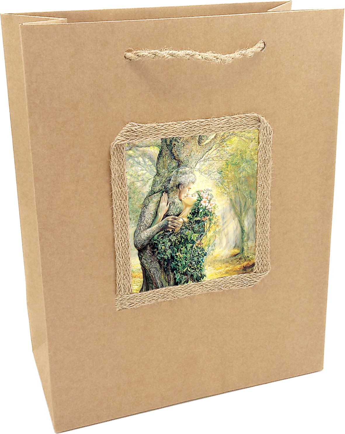 Elegancka torba papierowa w naturalnym kraftowym stylu, ozdobiona niezwykłą ilustracją przedstawiającą romantyczną scenę dwojga kochanków, których sylwetki harmonijnie łączą się z naturą, symbolizując nierozerwalny związek z przyrodą i siłę miłości. Ta artystyczna grafika wprowadza atmosferę magii i tajemnicy, czyniąc torbę idealnym opakowaniem na wyjątkowy prezent.