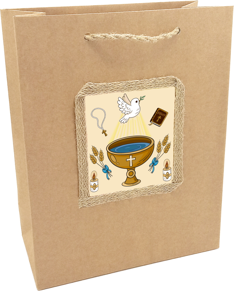 Torebka pełna symboliki w stylu dziecięcym, na upominek czy prezent dla każdego Maluszka z okazjisakramentu Chrztu Świętego. Subtelna grafika z gołąbkiem trzymającym w dzióbku kłos, Biblią, różańcem,chrzcielnicą i dwiema świecami.