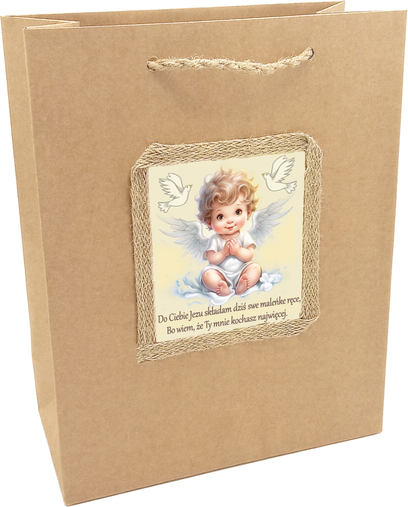 Podaruj prezent w wyjątkowej torebce z motywem graficznym przedstawiającym radosne, uskrzydlone dziecięskładające dłonie w modlitwie, której treść wypisana jest na obrazku:"Do Ciebie Jezu składam dziś swe maleńkie ręce, bo wiem, że Ty mnie kochasz najwięcej".