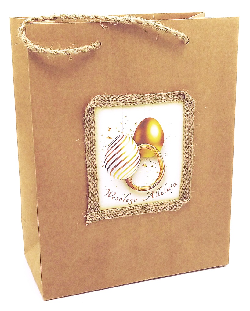 BLOGZ okazji Świąt Wielkiej Nocy poleca się torebka z tradycyjnym motywem pisanek o nietypowym charakterze. Jedno jajko niczym ze złota, drugiebiałe pokryte złotymi falami oraz trzecie będące kształtem jaja utkanym z wiklinowej plecionki, poniżej życzenie: