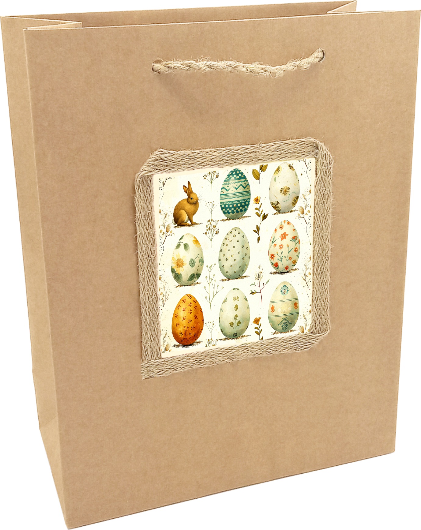 BLOGElegancka torba papierowa w naturalnym stylu, idealna do pakowania wielkanocnych prezentów. Wykonana z ekologicznego kraftowego papieru, ozdobiona subtelną ilustracją przedstawiającą piękne pisanki w pastelowych odcieniach oraz małego, uroczego zajączka wśród wiosennych kwiatów.