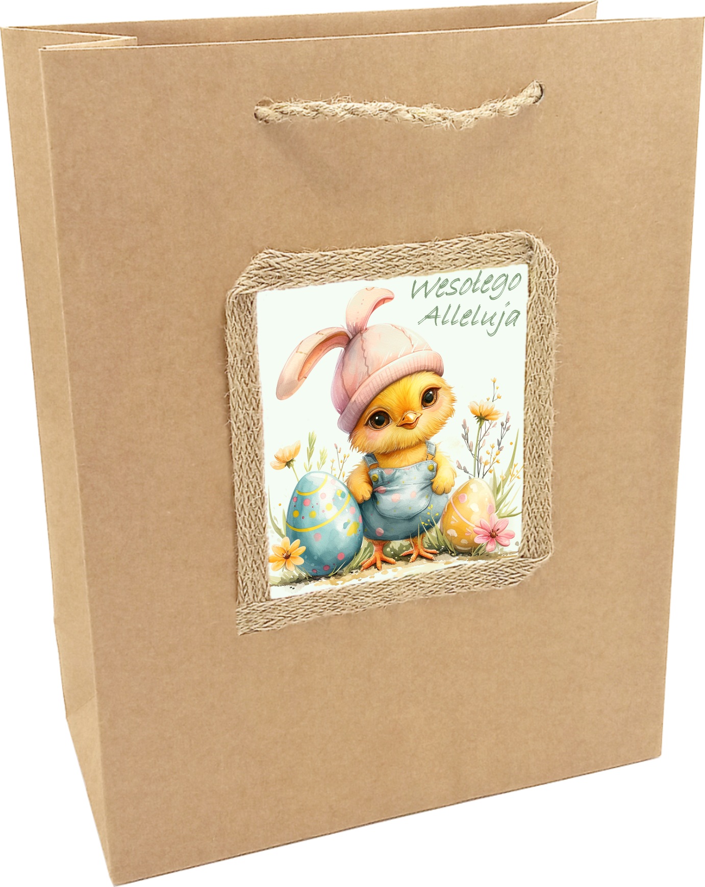 BLOGOryginalna i stylowa torba papierowa idealna na wielkanocne upominki. Wykonana z ekologicznego kraftowego papieru, ozdobiona uroczą ilustracją przedstawiającą żółtego kurczaczka w ogrodniczkach i różowej czapce z króliczymi uszami. Obok niego znajdują się kolorowe pisanki i wiosenne kwiaty, a całość uzupełnia napis "Wesołego Alleluja", podkreślający świąteczny charakter. Obrazek jest otoczony dekoracyjną taśmą jutową, co nadaje torbie rustykalny wygląd.