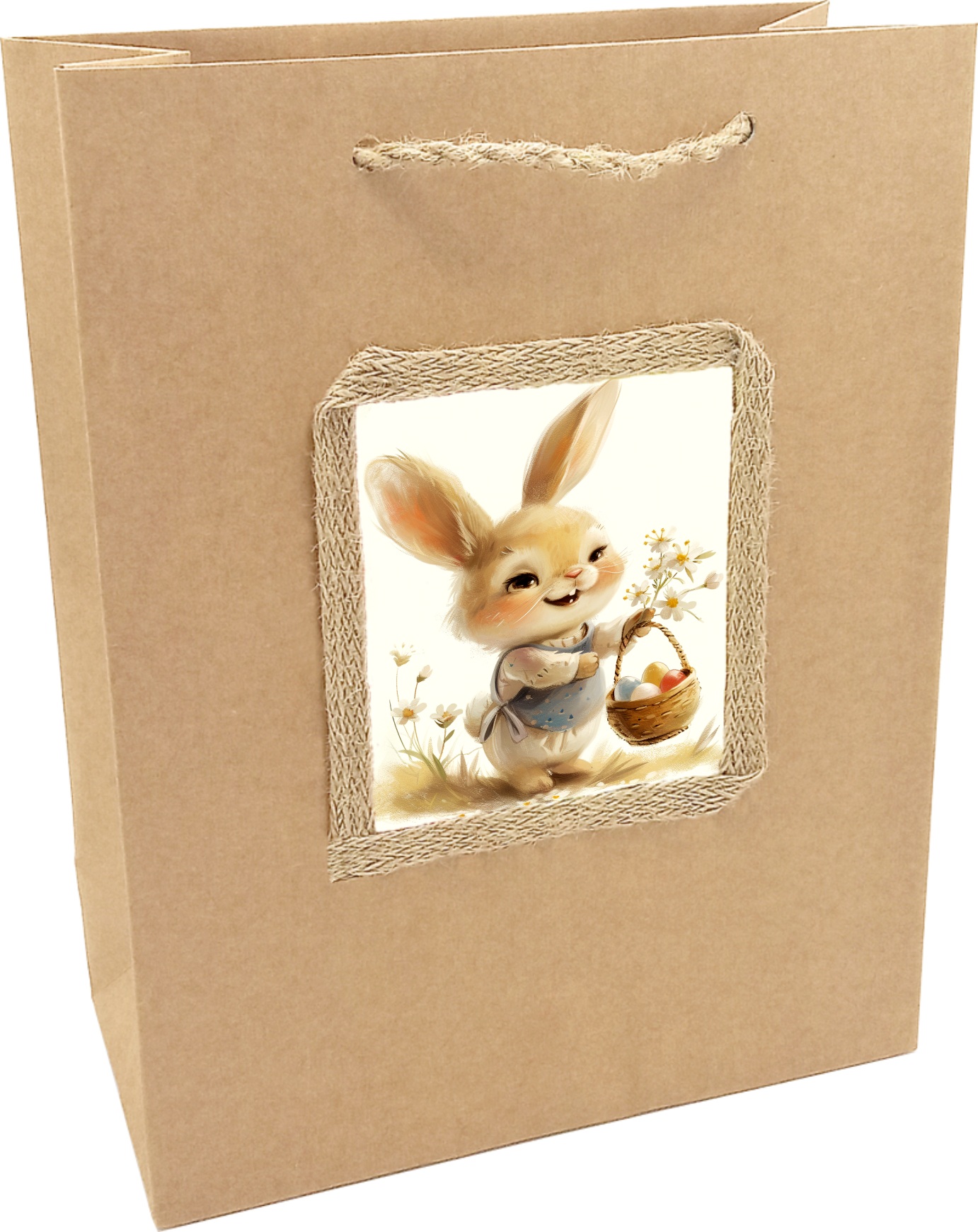 BLOGStylowa i urocza torba papierowa, doskonała na wielkanocne upominki. Wykonana z ekologicznego kraftowego papieru, ozdobiona piękną ilustracją przedstawiającą radosnego zajączka w ogrodniczkach, trzymającego koszyczek pełen kolorowych pisanek. W tle wiosenne kwiaty, które dodają całości uroku.
